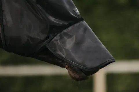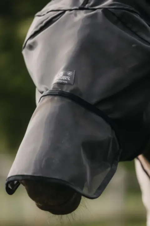 Le masque est fabriqué dans une maille résistante 100 % anti-UV et en lycra, qui ne laisse passer aucun insecte. Grâce au passepoil en plastique situé sur le front, le masque ne touche pas les yeux du cheval et reprend toujours sa forme initiale. Le masque se ferme à l’aide d’un velcro solide sous la mâchoire du cheval.