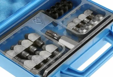 Mini-mallette bleue comprenant un assortiment de crampons tungstène répartis en deux tailles, bouchons et clés.