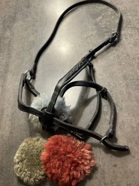 Muserolle croisée noire en cuir, en bon état. Vendue avec 3 moutons (rouge, vert, bleu).