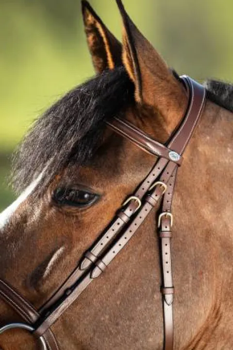 - Le bridon Anatomic HFI est doté d’une têtière, d’un frontal et d’une muserolle rembourrés et doublés de cuir souple de couleur cognac, offrant un ajustement confortable et élégant.