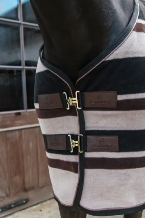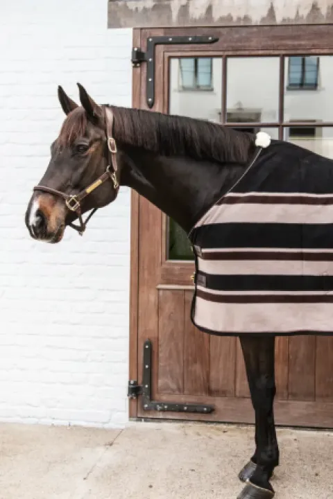 La Fleece Show Rug Heavy offre la sensation et l’aspect d’une couverture en laine sans tous les inconvénients que la laine peut avoir. La couverture est idéalement utilisée après l’entrainement ou après la douche par temps froid. Cette couverture en molleton épais, absorbe la sueur ou l’eau et veille à ce que votre cheval ne se refroidisse pas. Elle est dotée de deux sur-sangles élastiques avec des attaches détachables à l’intérieur, de sorte qu’elle puisse être utilisée durant les compétitions. Le liseré en cuir, le mouton artificiel autour du cou et les élégantes fermetures donnent un aspect très chic à cette couverture.