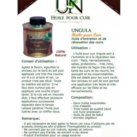 L’huile pour cuir Ungula sert à l’entretien et à la réparation des cuirs : filets, harnachements, selles, protections… Très riche, elle hydrate de façon très importante les cuirs et les nourrit, les assouplit et les imperméabilise. Elle est idéale pour les cuirs neufs. Son pinceau en poil de soie permet une application très facile et très efficace sur les filets et les harnachements.