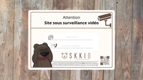 Plaque de box indiquant la présence de vidéo surveillance. Avec emplacement réservé pour écrire le nom du cheval ainsi que le numéro de téléphone du propriétaire.