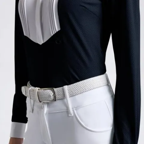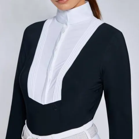 Le polo Hunter à manches longues pour femme présente un col montant en popeline et un plastron avec des détails plissés et des boutons cachés.