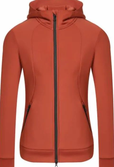 Sweat à capuche de la collection automne hiver 2025. Ce modèle se distingue par sa coupe féminine et cintrée, offrant un confort optimal grâce à son matériau en softshell. Idéal pour l’écurie, les entraînements ou la vie quotidienne.