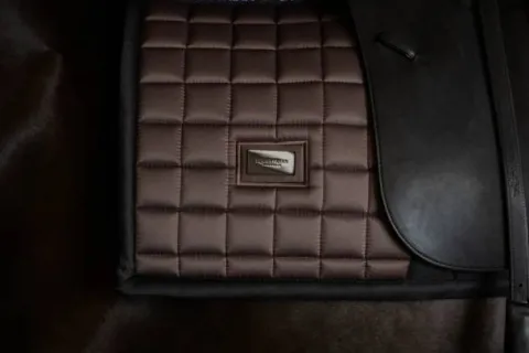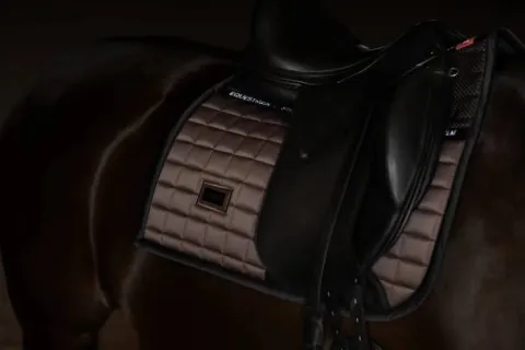 Tapis de selle sportif forme Dressage de couleur marron mocha. Possède un insert en mesh grip noir pour que la selle reste en place. Décoré du badge Equestrian Stockholm en noir.