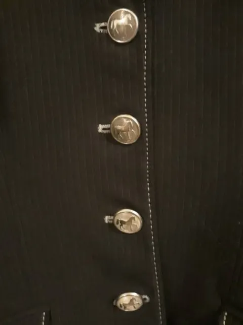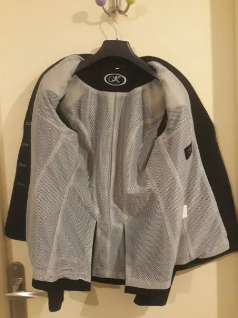Taille 38 de couleur noir avec rayures fines blanches. Tissu deperlant et stretch.