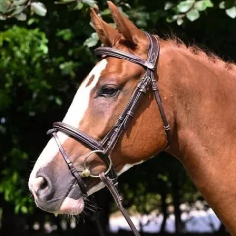 - Son frontal et sa muserolle sont surmontés par un cuir carré surpiqué en blanc, apportant une touche d’élégance.