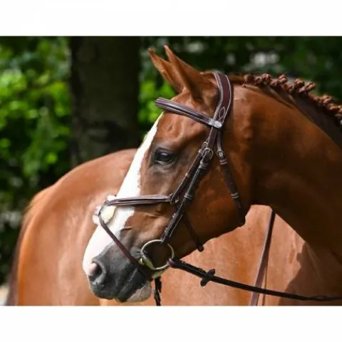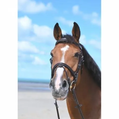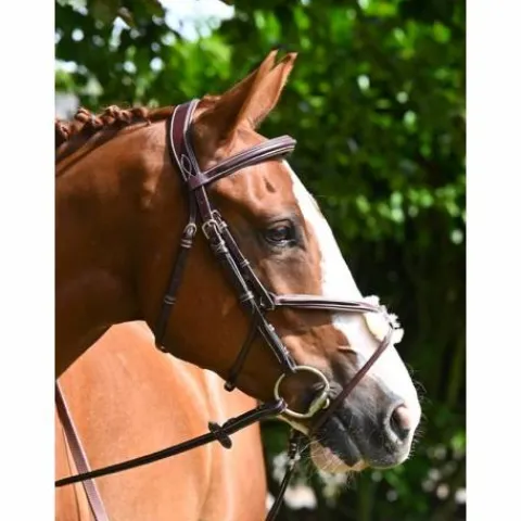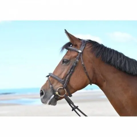 - Doté d’une tétière anatomique élargie, ce bridon répartit de manière égale et moins forte la pression sur les cervicales, assurant ainsi un confort accru pour votre cheval.