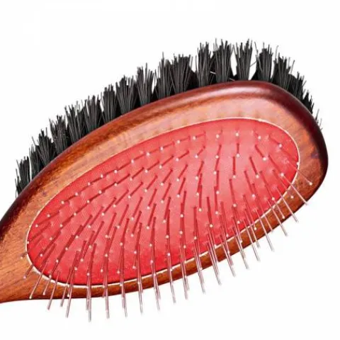 Brosse à crins Sprenger en bois, une face en poils métalliques chevillés sur caoutchouc, une face en poils souple. Avec manche.