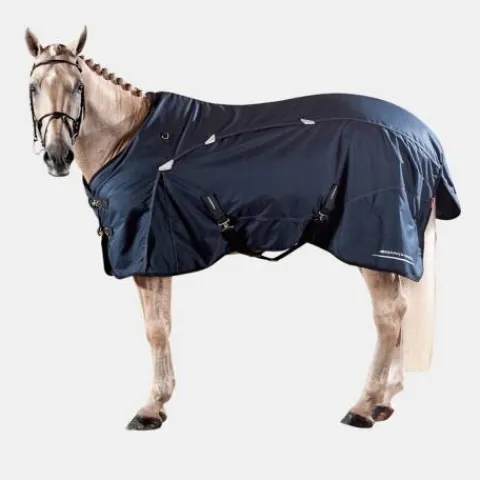 La couverture de paddock 1200 deniers de la marque Equiline est réalisée avec un système spécial de ventilation à soufflet, des coutures étanchées et des crochets croisés sous le ventre. 100% waterproof.