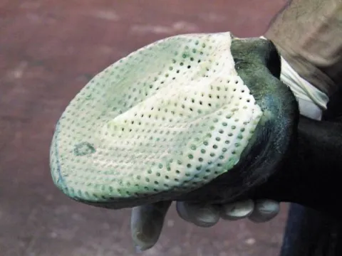 MV Second » Sole Race est une plaque de protection thermoformable spécialement adaptée pour les pieds des chevaux. Après avoir été plongée pendant environ une minute dans l’eau bouillante (minimum 75 °C), elle devient malléable et se moule sur le pied en épousant parfaitement la voûte, la fourchette et les lacunes.
