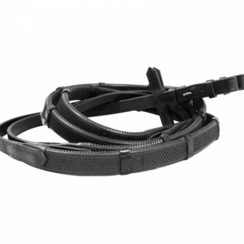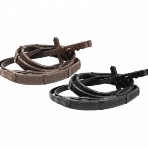 Ces rênes en caoutchouc sont conçues pour offrir une excellente adhérence grâce à leurs petits picots. Elles sont équipées d’arrêtoirs judicieusement espacés pour un confort optimal lors de l’utilisation.
