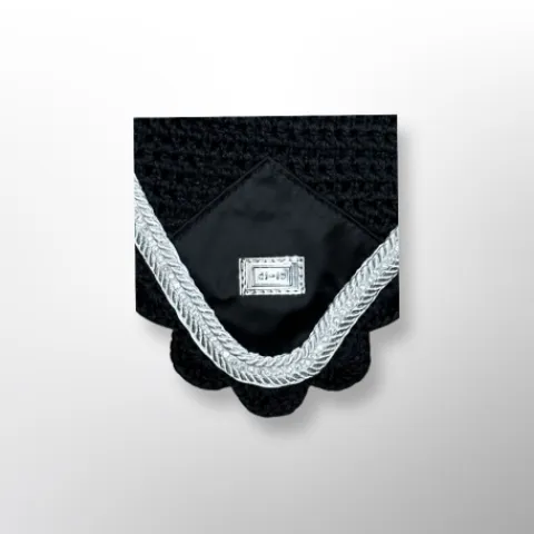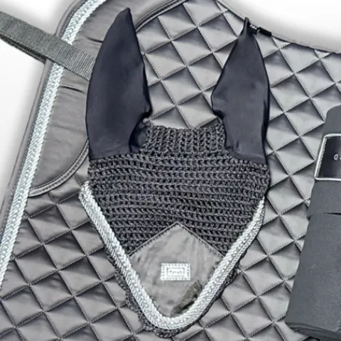 Les bonnets anti-mouches EQUICO sont fabriquées avec du crochet tricoté à maille ouverte pour donner un aspect respirant et du tissu élastique uni confortable sur les oreilles pour minimiser le bruit. Le filet de protection pour les oreilles est doté d’un passepoil en cordon avec une fine bande de cristal sur le devant avec le logo EQUICO en argent. Disponible dans une sélection de différentes couleurs (noir, gris étain, blanc et bleu français) assorties aux tapis de selle de saut et de dressage satinés EQUICO.