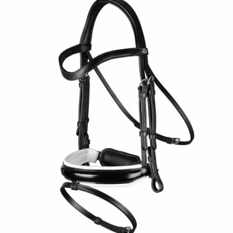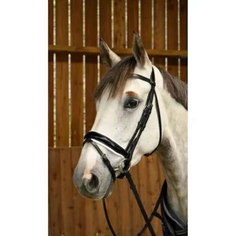Ce bridon avec muserolle combinée large et vernie de la Working Collection de chez Dy’on est fabriqué avec le meilleur cuir de buffle.
