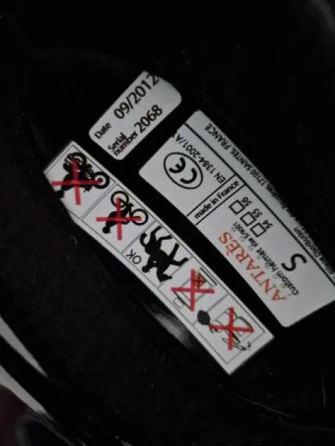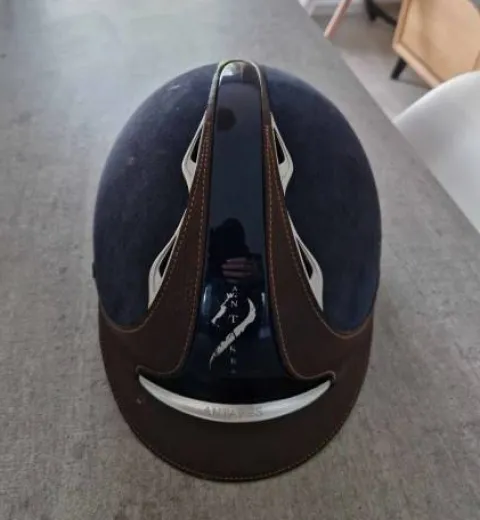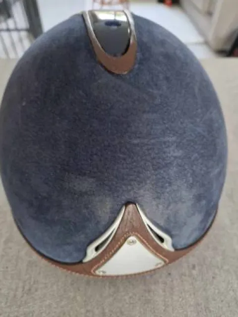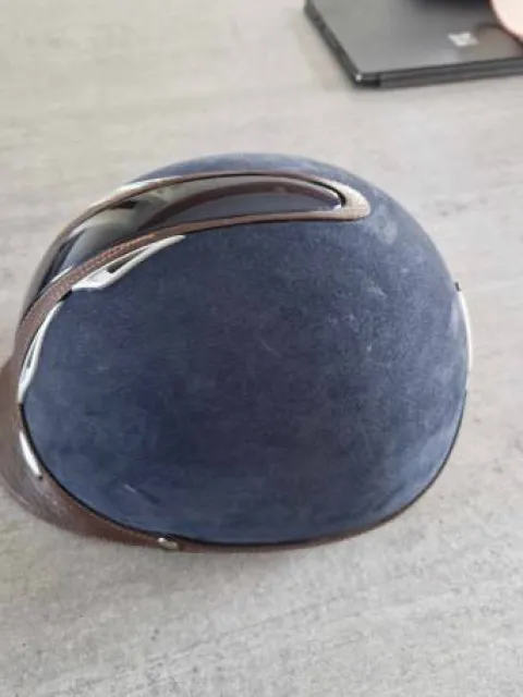 Casque en alcantara et cuir pour la coque de couleur marron et bleu foncé. Taille mouse S (54,55,56). Porté uniquement en concours, traces visibles sur la coque en alcantara (cf. photos)