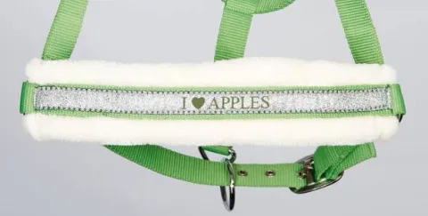 Licol doublé de fausse fourrure, décoré avec une bande argent avec écriture sur la muserolle. Têtière doublement réglable et muserolle réglable. Trous renforcés avec des oeillets.