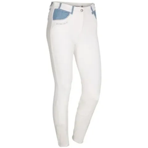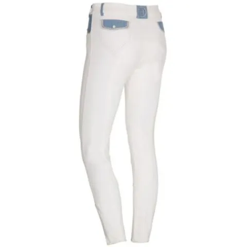 Pantalon d’équitatino pour femme avec détails en jean sur les poches avant et arrières, et sur les passages de ceinture