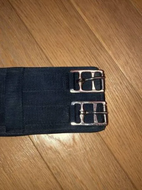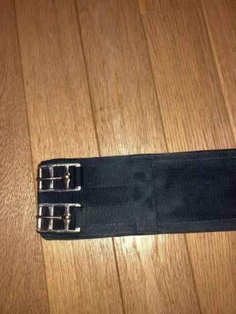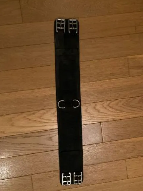 Sangle en très bon état, porté seulement deux fois. Les anneaux (situés au centre de la sangle) comportent cependant quelques traces de rouilles qui seront préalablement nettoyées, tout comme les sanglons. La sangle de surfaix est d’une matière confortable et agréable pour votre cheval. La sangle sera nettoyée et désinfectée avant l’envoi. Taille 70cm