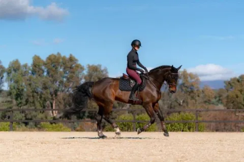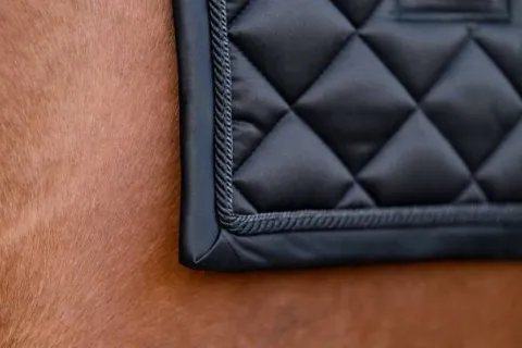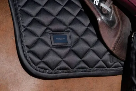 - Elégant tapis de selle de couleur noir avec des détails noirs et chrome. Décoré du badge Equestrian Stockholm de couleur chrome.