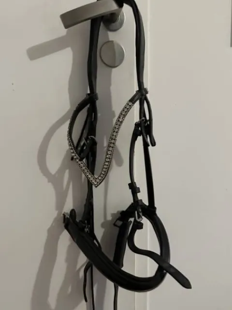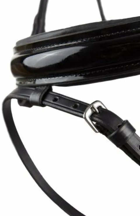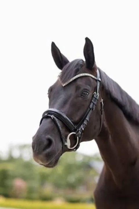 Un filet orienté dressage, doublé d’un matelassage, dont la beauté est surpassée par la façon dont il s’adapte parfaitement à la morphologie. La fine matelassure associée à la coupe anatomique au niveau des oreilles lui conférera un plus grand confort et une meilleure adaptation à chaque cheval. La fermeture de la muserolle, type pull-back, donc à rabat, se manipule facilement et permet un ajustement parfait. Le splendide frontal en forme de V est doté, avec beaucoup de goût, d’un unique rang de cristaux, juste ce qu’il faut pour briller.