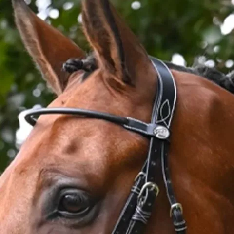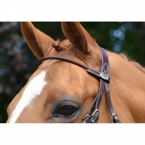 Frontal en cuir haut de gamme rond assorti au bridon Monday de la gamme Week et orné du pin’s argenté avec le logo Jump’In gravé.