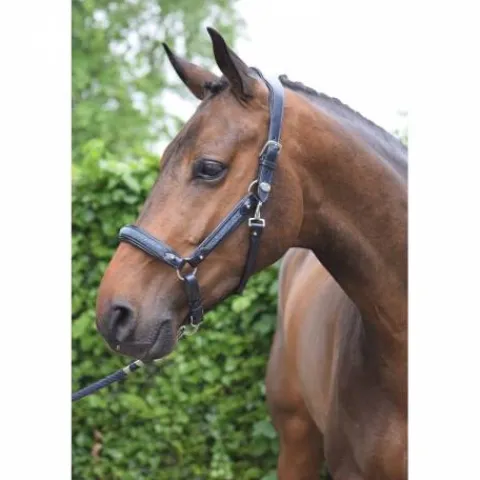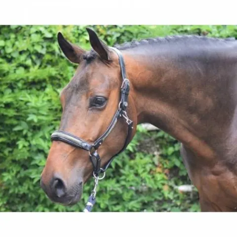 - Le licol se ferme facilement avec une boucle épaisse à gauche, et il est doté d’un mousqueton argenté qui sécurise la sous-gorge. La muserolle se ferme également avec une boucle, et le tout est relié à un anneau pratique pour une utilisation avec une longe.