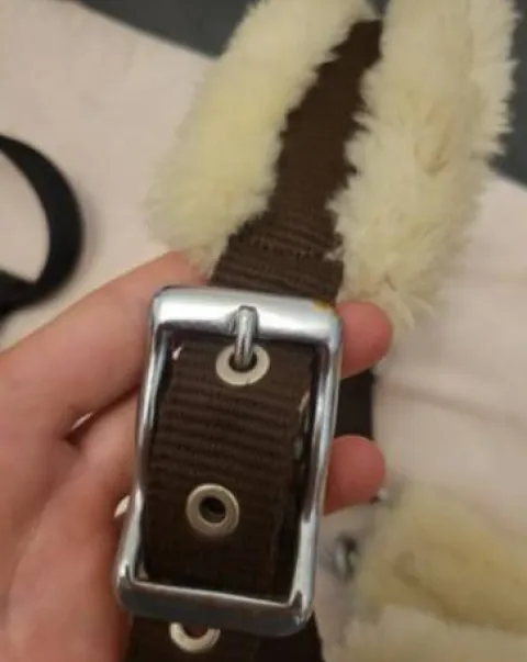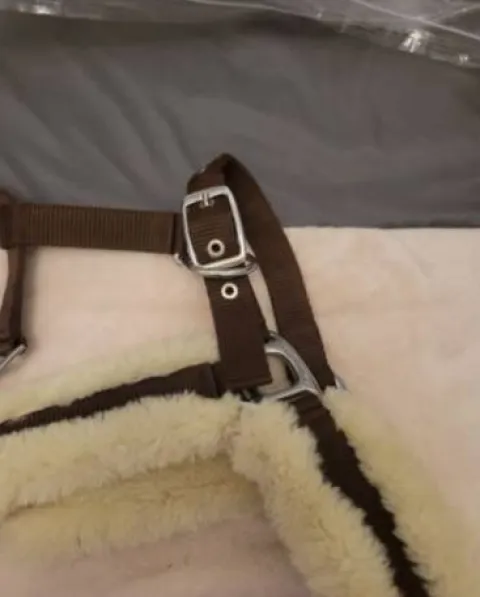 Licol très bon etat boucle qui fonctionne bien et brille. Réglable à la sou gorge et muserolle.