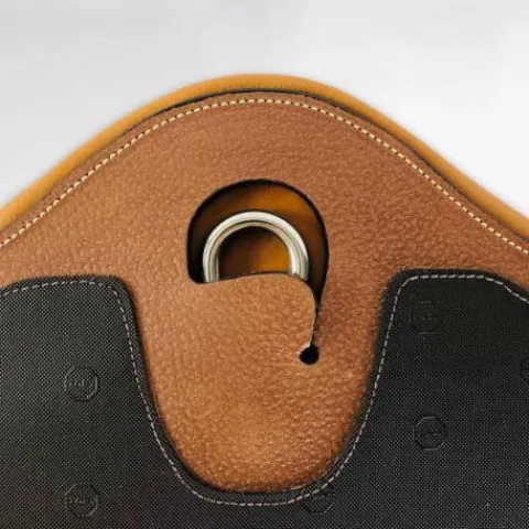- Protection du mousqueton d’attache d’enrênement à l’aide d’une découpe du cuir spécifique développée par Pravins Sellier,