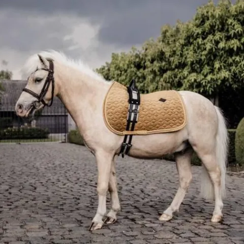 Le tapis de selle Velvet obstacle Kentucky est conçu pour une selle d’obstacle. Le modèle est de couleur mourtarde.