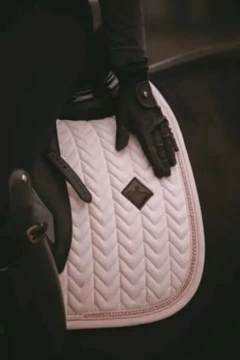 Le tapis de selle Velvet Pearls n’a pas de sangles gênantes à fixer à la selle. Pour rester en place sous la selle, l’intérieur du tapis est structuré en gaufre. Cet intérieur gaufré sèche rapidement et offre un effet amortissant sous la selle. Pour que vos bottes ne soient pas endommagées par les perles, il y a une découpe spéciale pour les perles à côté du passage de sangle. L’écusson en cuir artificiel est placé un peu plus haut sur le tapis de selle pour laisser de la place à la broderie.