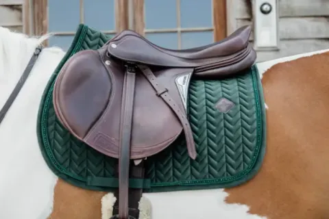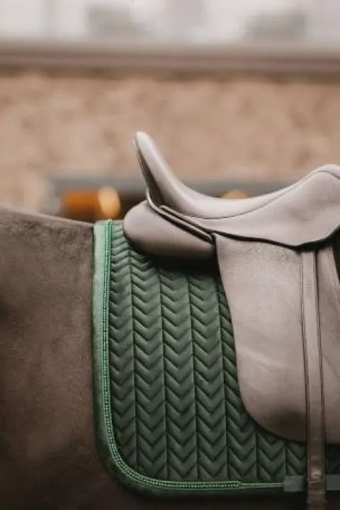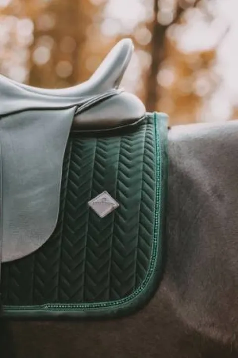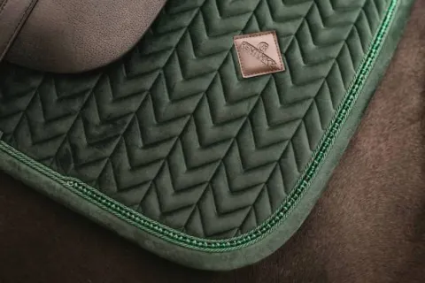 Fabriqué avec les meilleurs matériaux, le tapis de selle perles de velours est non seulement agréable à regarder, mais aussi à porter pour votre cheval. Le tapis de selle existe en différentes couleurs pour s’adapter à toutes les couleurs de robes. Tissus et matériaux L’extérieur du tapis de selle est fabriqué à partir de notre célèbre et doux tissu velvet surpiqué en « Fishbone ». Le passepoil est terminé par des perles très chics. La doublure du tapis de selle est un mélange de coton et de polyester qui absorbe facilement la sueur et est très respirant.