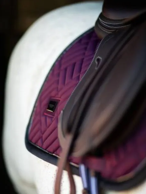 Tapis de selle élégant avec des surpiqures modernes, en violet foncé avec des détails noir et argent. Décoré d’un badge Equestrian Stockholm en noir.