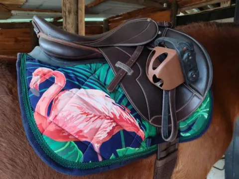 Ce tapis de selle original à motif flamant rose est de taille cheval. Va très bien aussi sur un Cob.